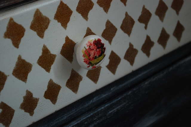Witam :):) Tak jak przewidziałam, ciemna podłoga nie zdała egzaminu w mojej łazience.Do przesadnie pedantycznych nie należę a posiadając w domu zwierzęta, trzeba liczyć się z bałaganem, jednak pokonała mnie biała sierść na ciemnej podłodze!!!!! I co tu teraz zrobić? Kuć kafli nie będę a muszę czymś rozjaśnić.No i wymyśliłam. Szablon z "marokańską koniczyną"...a jak!!! Jeśli komukolwiek z Was przyjdzie kiedyś taki pomysł do głowy ,natychmiast skontaktujcie się z lekarzem lub farmaceutą!!! Drugi raz już tego nie zrobię,to był wysiłek nadludzki,przez ponad tydzień,operując tylko jednym szablonem i wałeczkiem ....dokonałam tego: